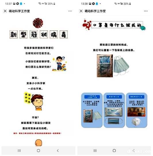 萌动科学工作室积极策划与时下疫情相关的线上儿童科学活动,为更多的学校、幼儿园、家庭提供线上科学教育活动资源。以“病毒大作战”为主题,推出系列活动,带领孩子们共读的《妈妈要去打怪兽》的绘本,将当前的新冠病毒比喻成怪兽,以小朋友能听得懂的语言,来描述病毒、人体的抵抗力和现在人们在做的事,以及为什么孩子们不能像以往一样外出玩耍,成为了当前疫情下大热的儿童科普读物;录制的中科院微生物所专家讲解的“新冠病毒从哪里来”“它会害怕什么”等视频,为小朋友们从多个角度进行“权威解密”,还为小朋友们设计了可以动手参与的“任务清单”,做到不仅“会学”更要“能做”;另外,“口罩的秘密”、“口罩外面的世界”,带领孩子们一起了解口罩的来历、构成及使用方法。截至目前,10000余人次参与活动。
