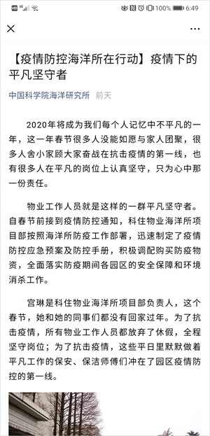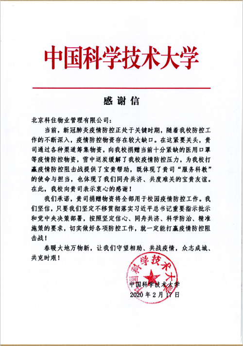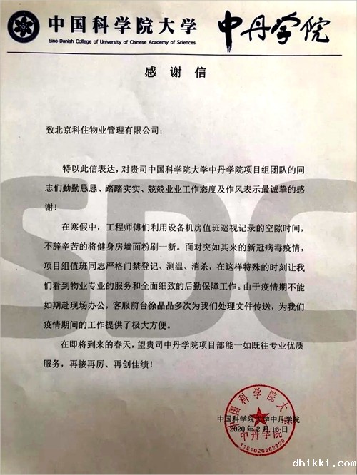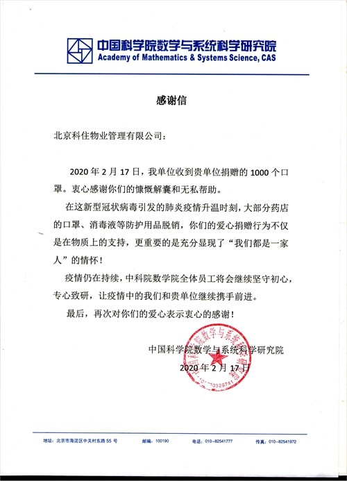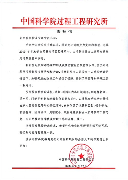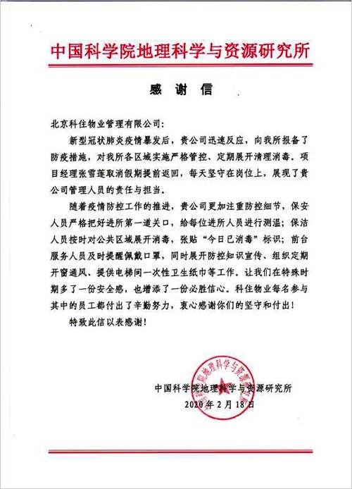 中科院数学院、过程工程所、地理资源所、北京基因组所、海洋所、中国科大、国科大中丹学院称赞科住物业在疫情防控工作中积极行动、迅速反应、团结协作、周密配合、严格管控,在防疫物资十分紧缺的情况下,这院所及时提供物资支援,体现了科住物业优秀的服务意识、良好的职业素养、细致的工作作风、全面的保障能力,体现了“一家人”的朴素情怀、“一家情”的意切情真、“一家亲”的平凡坚守,体现了作为中科院科研保障专业队伍的使命担当,