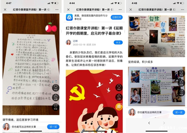 此外,在全校范围内开展“红领巾微课堂”活动,组织学校大队委们在微信上讲解和展示自己在延学期间的生活,读书、跳绳、看时事、做家务……将严于律已、广闻时事、心怀家国的优良作风传播给每一位启元学子,让孩子来引导孩子,让孩子在同龄人中找到自己的榜样,增强学习的动力。