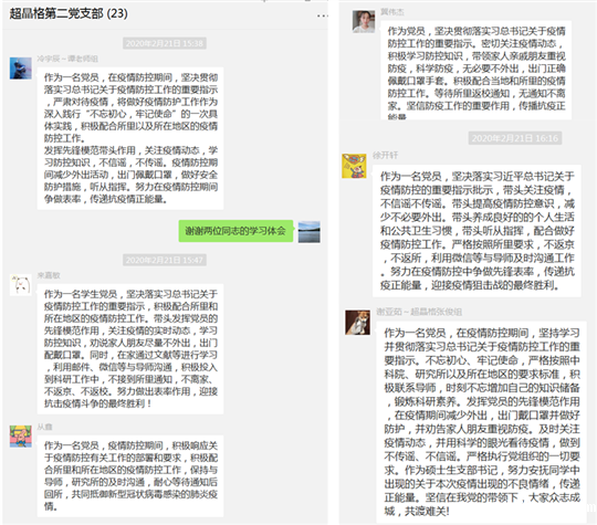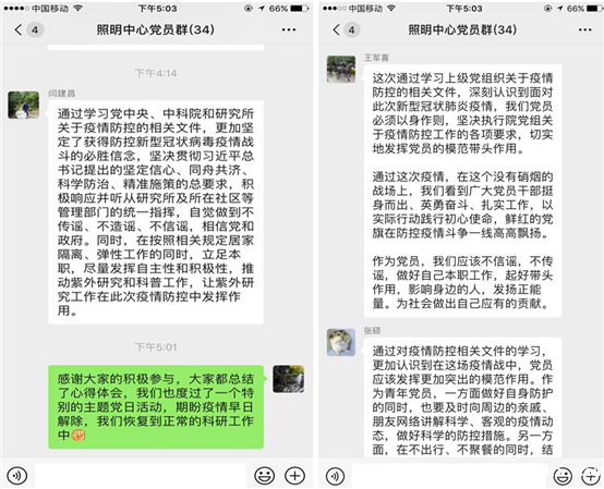 所属各党支部(总支)、党小组积极响应。党日活动内容主要分为开展党员“自学+讨论”及缴纳党费两部分。在“自学+讨论”环节,党员们重点学习了《中共中国科学院直属机关委员会转发〈关于进一步加强中央和国家机关疫情防控有关工作的通知〉的通知》、《中共中国科学院党组关于加强党的领导在防控疫情斗争中充分发挥党组织和广大党员、干部作用的通知》、《半导体所党委致全体共产党员的倡议书》等三个文件重要精神。党员们在认真自学文件后通过微信群展开了充分的讨论,分享了对统一行动、听从指挥的认识,对疫情期间共产党员及科技工作者的使命和担当,对参与疫情防控前线工作人员的敬意等方面的心得体会。固态光电信息党支部还通过微信群组织党员共同在线观看了《我是共产党员,我先上》歌曲视频。在缴纳党费环节,大家做到不聚集,通过网络平台按时足额缴纳党费。