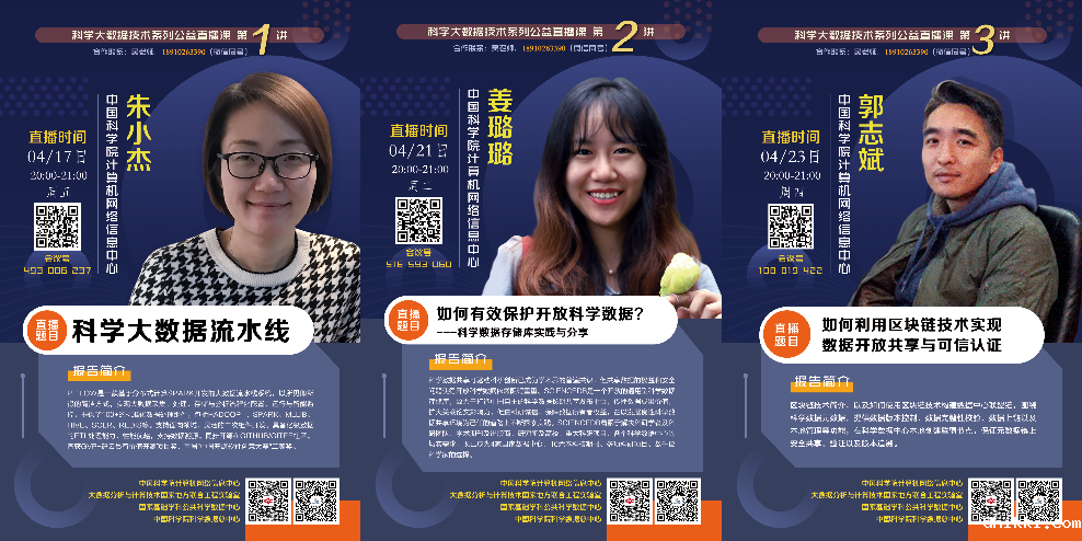 为了更好的服务领域科学家,最大限度降低疫情防控对科研人员交流的影响,促进科研信息化技术与应用结合工作,近日,计算机网络信息中心大数据部借力互联网技术,以“在线直播”的方式开展了一场“科学大数据技术系列公益直播课”,引起了领域内相关科研工作者的热烈关注。截至当前,该系列公益直播课已成功举办科学大数据流水线技术、开放科学数据存储与出版、应用区块链技术实现数据可信认证等3个主题报告分享,累计参会230多人,参会老师踊跃提问、交流互动,产生了良好效果。后续,我们将陆续推出分布式科学数据管理与发布、领域知识图谱构建与应用、遥感大数据平台关键技术等主题,全面立体地分享团队在科学大数据的科研成果与应用经验,欢迎老师们给予更多关注与支持。