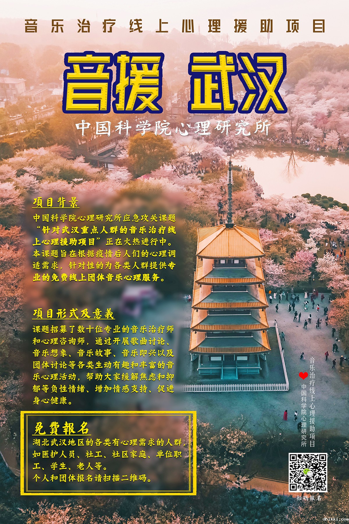 “音援武汉”线上音乐治疗心理援助项目旨在为受到新冠肺炎疫情影响的武汉及全国其他地区的各类重点人群提供公益的线上团体音乐心理活动。项目开展两周以来,已为来自武汉及其他地区的医护人员、隔离人员、大学生、社区家庭、特需儿童及家长开展了十多场内容丰富的音乐心理活动,帮助大家缓解焦虑、抑郁、孤独感等负性情绪,逐渐走出疫情的负面影响,以良好的心理和情绪状态回归到正常的工作、学习和生活中。