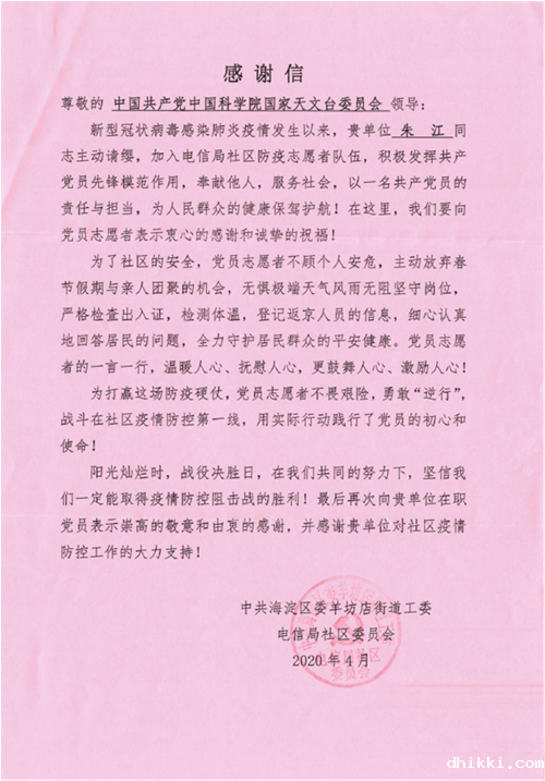 日前,国家天文台党委收到一封来自中共海淀区委羊坊店街道工委电信局社区委员会的感谢信。信中对天文台机关党总支朱江同志在春节疫情期间主动放弃春节假期与亲人团聚的机会,积极参与社区一线疫情防控的担当作为进行了肯定和赞扬,对台党委大力支持社区疫情防控工作表示了感谢。
