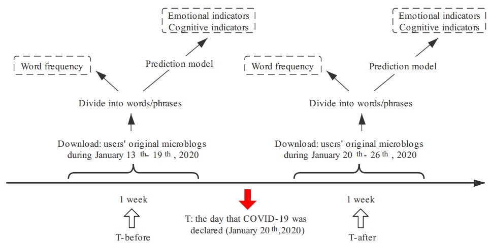 为此,中国科学院行为科学重点实验室朱廷劭研究组的科研人员对17865名活跃微博用户(2019.12.31-2020.1.26期间微博数≥50)进行研究,下载2020.1.13-2020.1.26期间这些用户全部的原创微博,并以1月20日作为分界点,将其分成疫情定性前(2020.1.13-2020.1.19)和疫情定性后(2020.1.20-2020.1.26)两部分数据,通过词频分析和心理指标预测从认知和情绪两个方面来研究新冠肺炎疫情定性前后民众心理变化的情况。
