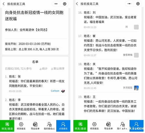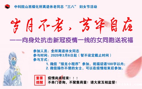 今年的“三八”妇女节,正值举国上下抗击新冠肺炎疫情的关键期,为响应国家防疫号召,山西煤化所离退休人员管理处巧思妙想,创新工作方式,借助新媒体平台,通过微信小程序接龙功能,开展了主题为“岁月不老,芳华自在——向身处抗击新冠疫情一线的女同胞送祝福”活动。